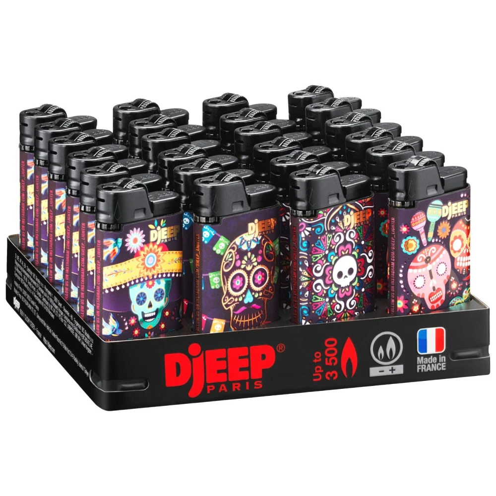 Les briquets Djeep possèdent une silhouette originale. Large et fin, ces briquets premium sont fabriqués en France. Découvrez une plaquette de 24 briquets assortis de la collection « Fiesta », avec des designs Calaveras dans le style Mexicain. Environ 6 x 3.5 cm, décors uniques grâce à une combinaison de matières avec des parties holographiques