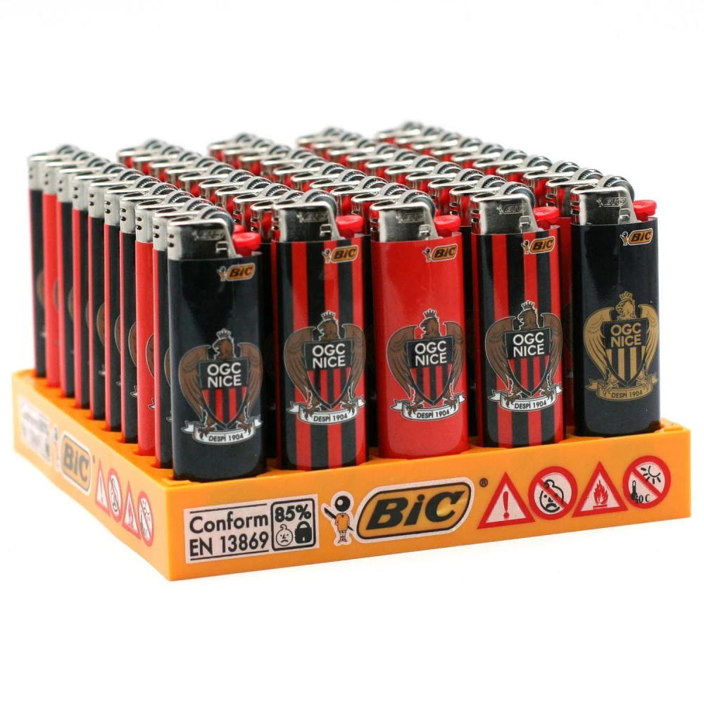 Plaquette complète avec 50 briquets BIC J26 (grand format) supporter de l’équipe de l’OGC Nice. Avec 4 modèles différents comprenant des motifs dans les tons rouge, blanc, noir et doré. Parfait pour les fans des Aiglons !